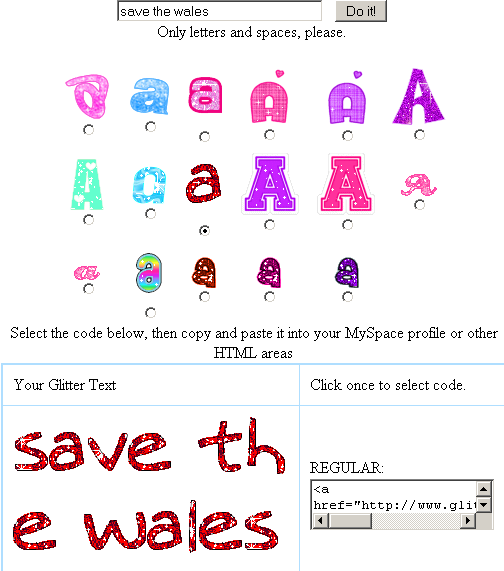 Generators such as this one allow you to enter as much text as you want and make it glittery. You get to choose from the unbelievable array of sparkling things. Such collections offer glittery graphics for every occasion – whether you need to say hello or goodbye, to thank someone, wish a good day or just to sparkle and let your cursor and userpic sparkle with you.